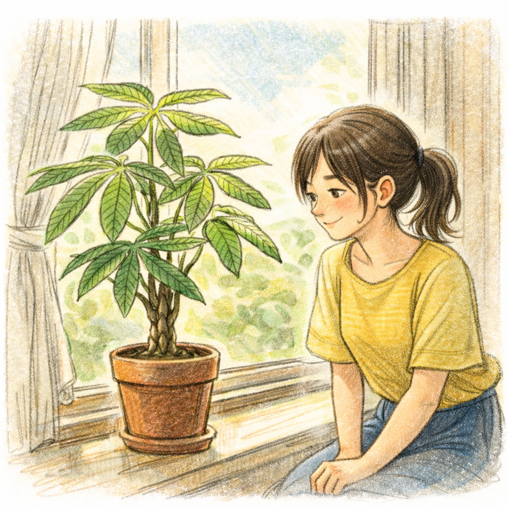 20代後半、一人暮らしの部屋に観葉植物(パキラ)を置いていました。ある夜、ふとこんなことを思いました。「わたしは100年生きられるかどうかだけど、この子はずっと成長して何百年でも生きていけるんだなぁ」と。そして心の中でこう話しかけました。「あなたは葉を落としても、また新しい葉が生まれて、ずっとずっと永遠に生きて大きくなれるんだよ。素敵だね」と。